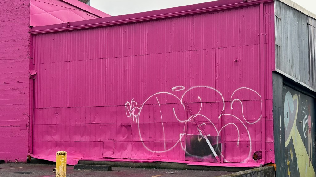 Behind 69 W 3rd Ave, Vancouver – The eagle has been painted over and all that remains is the bottom of a feather visible in the black rectangle